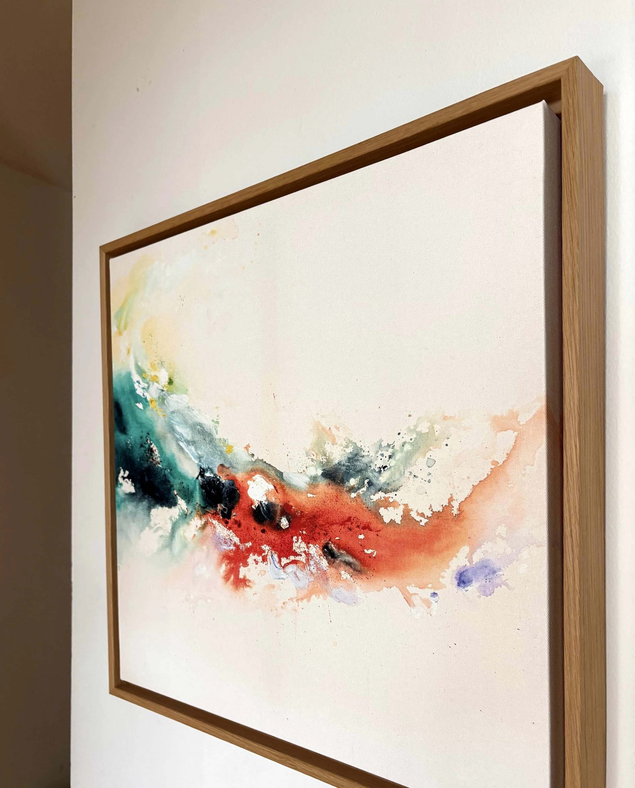 The canvas is stretched over a solid, 4 cm deep wooden frame and finished in handcrafted oak shadow frame, warm, grounding, and quietly architectural.